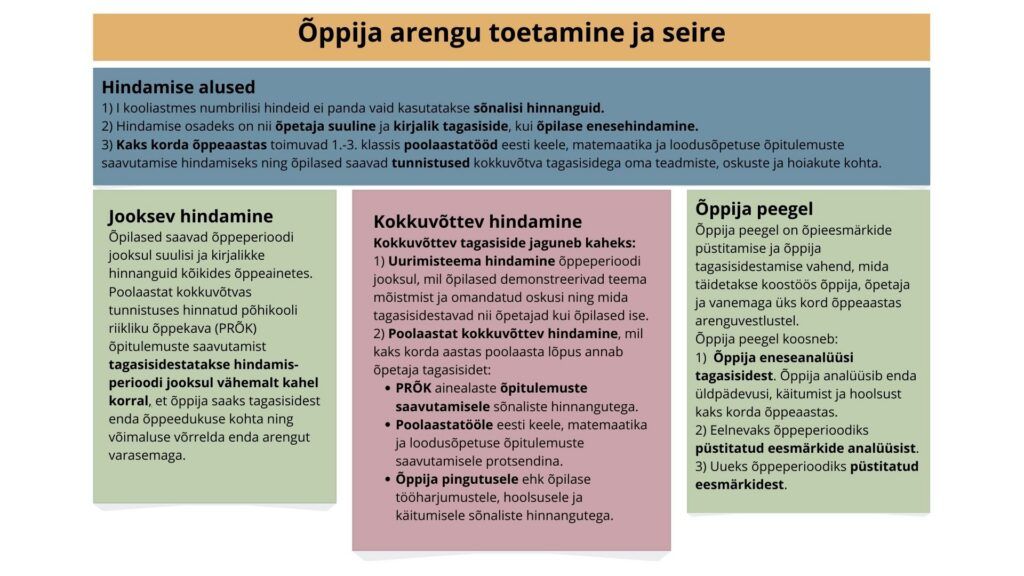 Kaks korda õppeaastas (I poolaasta lõpul jaanuaris ja II poolaasta lõpul juunis) saavad esimese kooliastme õpilased oma teadmiste, oskuste ja hoiakute kohta kokkuvõtva kirjeldava tagasiside.