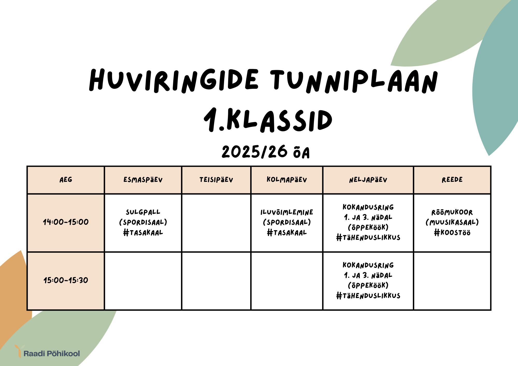 Koolis hakkab igal reedel kell 14:00 muusikaõpetaja Ille juhendamisel koos käima rõõmukoor ning üle nädala neljapäeviti toimub õppekorraldusjuht Grete juhendamisel kokandusring (osalejate arv kuni 8 õpilast).